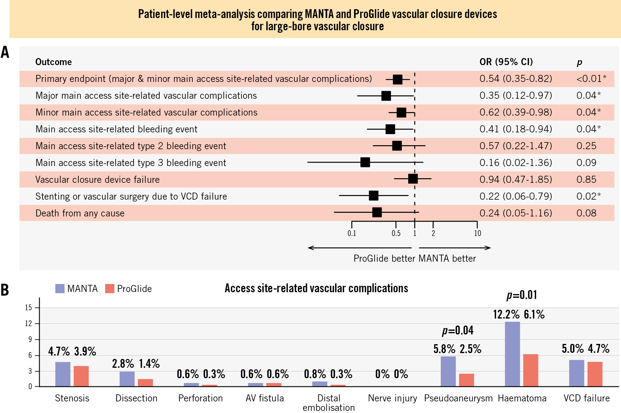Central illustration. ProGlide- versus MANTA-based vascular closure technique for large-bore arterial access: a patient-level meta-analysis of two randomised trials including 722 patients. Outcome assessment according to Valve Academic Research Consortium-3 criteria. A) Primary and secondary endpoints. B) Details of access site-related vascular complications. *Indicates statistical significance. AV: arteriovenous; CI: confidence interval; OR: odds ratio; VCD: vascular closure devic