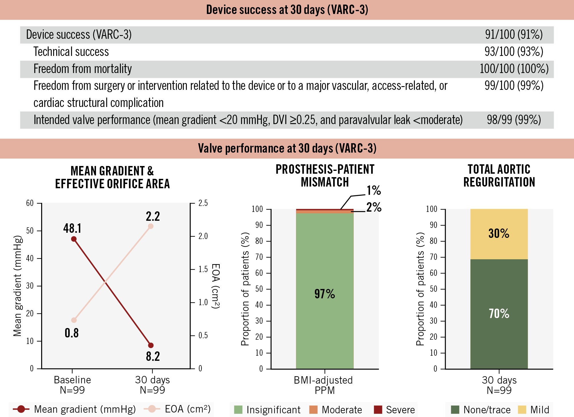 Device success per VARC-3 criteria was achieved in 91% of patients (Figure 3). One patient developed a late external iliac artery thrombus requiring vascular intervention, and one other patient exhibited a residual mean transprosthetic gradient >20 mmHg, attributed to leaflet thrombosis detected on post-TAVI CT imaging. At 30 days, the mean transprosthetic gradient was 8.2±3.1 mmHg, with a mean EOA of 2.2±0.3 cm2, and mean DVI of 0.60±0.10. The incidences of moderate and severe PPM were 2% and 1%, respectively. No patients had greater than mild PVL.