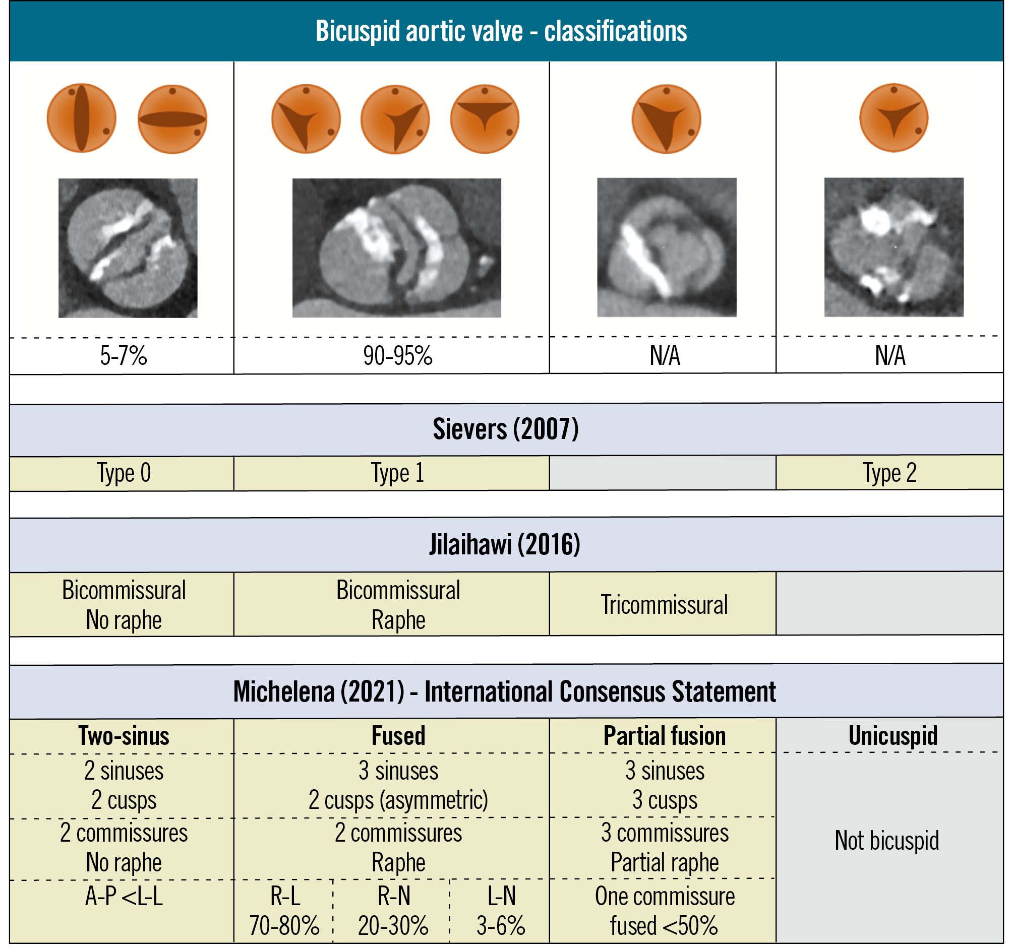 Classification of BAV disease is essential for understanding its clinical presentation and guiding therapeutic strategies, particularly in the context of TAVI. Over the years, several classification systems have been proposed to categorise BAV anatomy based on cusp morphology, the presence of a raphe, and commissural orientation (Figure 1). The Sievers classification, based on the number of raphes, remains the most broadly adopted in daily clinical practice, although it does not cover the full complexity of BAV anatomy7. It divides BAVs into three phenotypes: type 0, when there is no raphe; type 1, when there is a raphe connecting two cusps; and type 2, when two raphes are identified. Sievers type 1 BAV, with a raphe between the right and left coronary cusps, is the most common phenotype in Western TAVI populations. Type 0 BAV seems to be more frequently encountered in Asian TAVI populations, while type 2 BAV is a rare phenotype worldwide and could more accurately be termed a unicuspid instead of a bicuspid aortic valve17. With the advent of multislice computed tomography (MSCT) imaging for TAVI procedural planning, Jilaihawi et al proposed another classification based on computed tomography (CT)-derived anatomical insights, categorising BAVs into bi- and tricommissural types8. Although it addresses some of the limitations of the Sievers classification and better evaluates supra-annular structures for TAVI planning, its adoption in daily clinical practice remains infrequent. The International Consensus Statement, introduced in 2021, offers a more comprehensive and clinically relevant definition of a BAV, complementing the Sievers and Jilaihawi classifications9. It classifies BAV anatomy into three major phenotypes: two-sinus, fused, and partial-fusion types. The system further incorporates cusp symmetry, commissural angles, and the presence and characteristics of a raphe. For example, the fused BAV type, which is the most common, involves the fusion of two cusps – most frequently the right and left coronary cusps – with a raphe that may or may not be calcified. The International Consensus Statement enables a precise BAV classification, facilitating procedural TAVI planning. This classification also identifies a partial-fusion BAV and excludes unicuspid variants, unlike the Sievers classification. However, the concept of a fused BAV may be somewhat misleading because “developmentally” this phenotype is the result of incomplete cusp separation and must be distinguished from a fused commissure in tricuspid aortic valves.