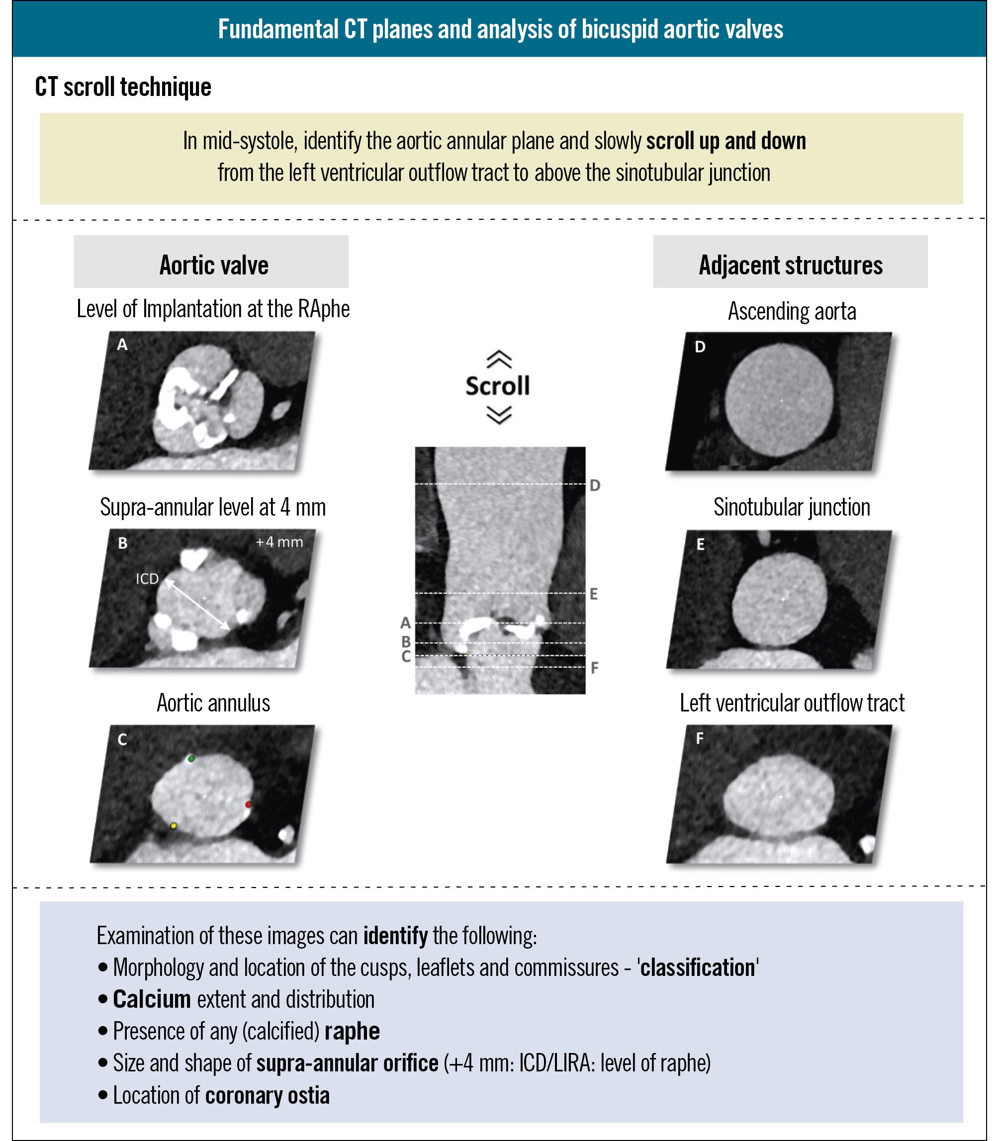 Figure 2. Fundamentals of CT analysis of bicuspid aortic valves for TAVI treatment planning. The CT scroll technique ensures a comprehensive assessment of the aortic valve complex and aortic root. Precise measurements are made at different planes, including some specific planes to bicuspid aortic valve disease. CT: computed tomography; ICD: intercommissural distance; LIRA: Level of Implantation at the RAphe; TAVI: transcatheter aortic valve implantation