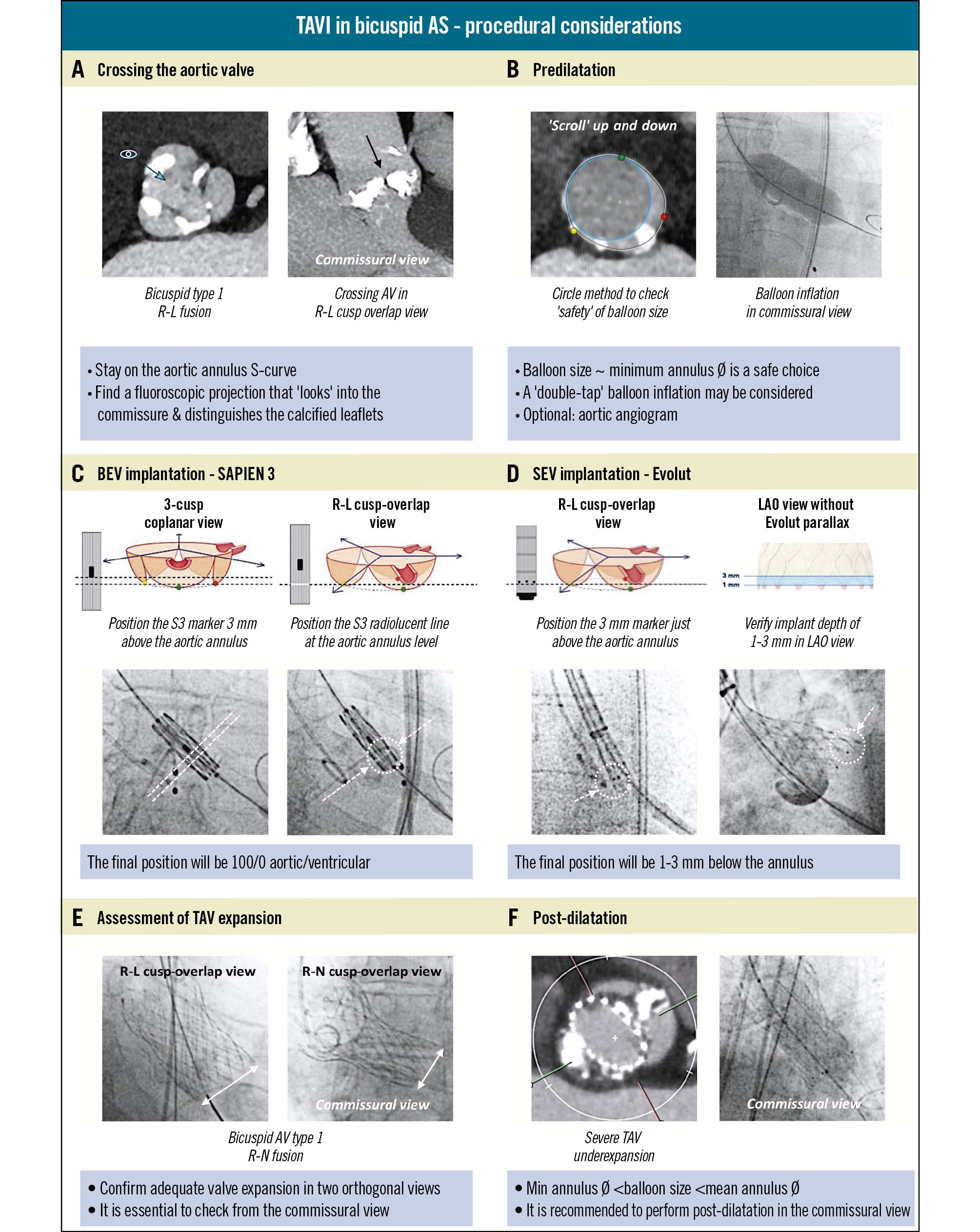 Abicuspid aortic valve (BAV) is the most common congenital structural heart abnormality, affecting 0.5% to 2% of the general population and found in 5% to 20% of transcatheter aortic valve implantation (TAVI) populations in the Western world1. The epidemiology of BAV may be different in Asia, as approximately 50% of patients presenting for TAVI in China are reported to have a BAV morphology2. However, this may simply reflect the younger age of these populations, as the prevalence of a BAV is much higher in younger aortic stenosis (AS) patients compared to older patients. BAV anatomy predisposes to early valve degeneration, which may lead to severe AS and/or aortic regurgitation (AR) and a need for surgical aortic valve replacement (SAVR) at a young age3. Surgery has long been the gold-standard treatment for severe symptomatic bicuspid AS and remains the first-choice treatment for most young BAV patients with low surgical risk. For older BAV patients and those at high surgical risk, TAVI has become an accepted and appropriate treatment option. Contemporary TAVI in selected bicuspid AS patients has been reported to have similar clinical outcomes compared to TAVI in tricuspid AS patients45. However, due to relevant anatomical differences, BAVs may be associated with an increased risk of suboptimal procedural outcomes and complications in case of TAVI (Central illustration), underscoring the need for careful patient selection and the use of patient-tailored TAVI strategies to achieve optimal outcomes6. This review article aims to give a state-of-the-art overview of our knowledge on TAVI in bicuspid AS and to discuss future directions.