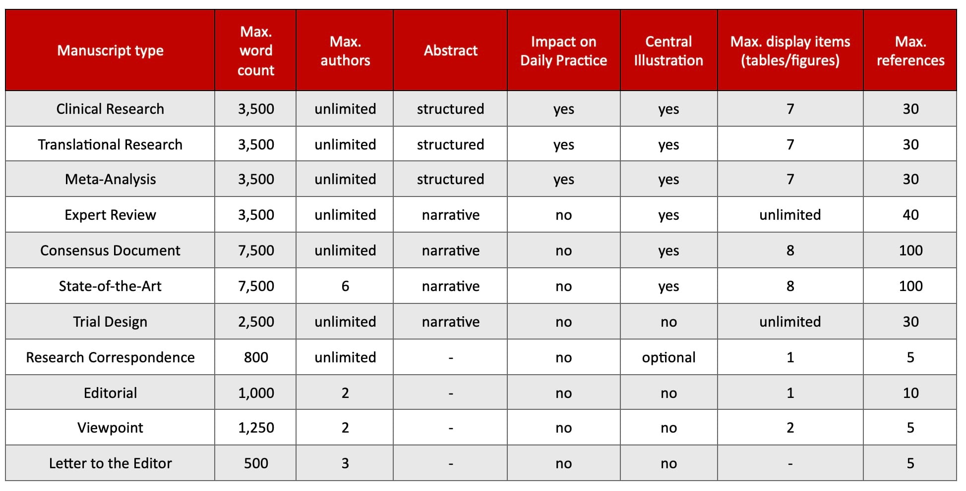 All word count limits are intended for the text from the introduction to the conclusion, and they exclude abstract, figure legends, and table notes. For any text exceeding the word limit, upload of supplementary material is permitted. For some categories, a Central Illustration and/or a panel named “Impact on daily practice” is required.